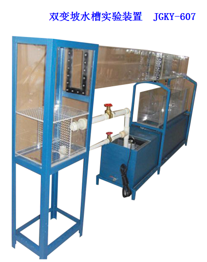 2、實驗槽道:全長11m有機玻璃雙變坡水槽,前后段有兩個可根據需要調節不同坡度的活動軸裝置。