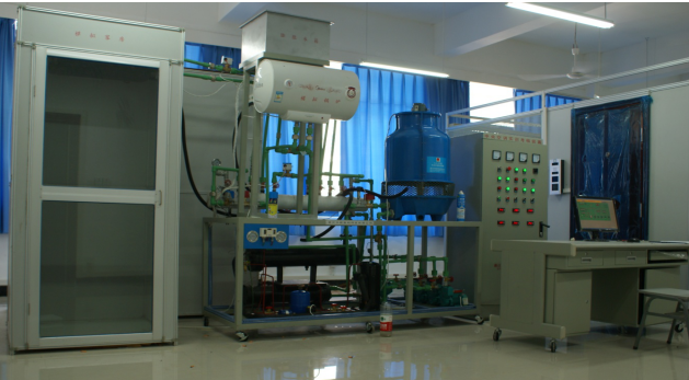 由壓縮機(jī)、螺旋式冷凝器、螺旋式蒸發(fā)器、儲液罐、熱力膨脹閥、視液鏡、干燥過濾器等組成,管路中還設(shè)有控制閥等實(shí)訓(xùn)所必需的部件,管路中視液鏡可觀察制冷劑狀態(tài)等設(shè)備組成。制冷機(jī)組主要完成制冷工作,制冷劑為R22。
