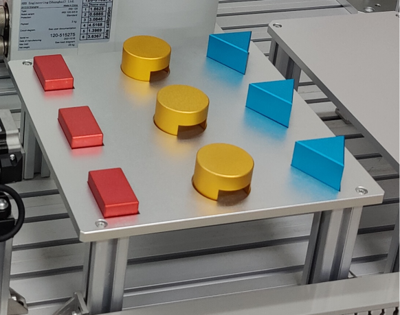 1 、分揀搬運: 配備圓形、三角形、方形等物料模板;機器人可精準完成各種形狀物料分揀搬運;可擴充配置視覺組件,選配視覺條件下可完成全自動分揀(含顏色、位置、坐標、角度等識別);