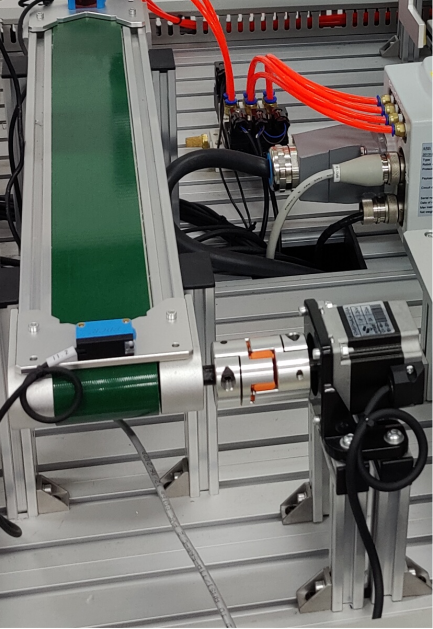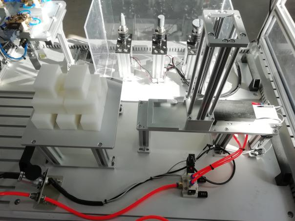 2 碼垛:碼垛是模擬工業場合的自動搬運碼垛功能設計,可以自動記錄碼垛位置和高度,具有重復精度高,自動計算旋轉角度等功能;工業機器人工具盤上安裝了氣動吸盤;包含一個輸送帶,采用步進電機驅動;電機速度可以進行調節;可以實現將模擬物料送到輸送帶上進行定向傳送;具有傳感器能夠檢測模擬物料是否到達指定位置。