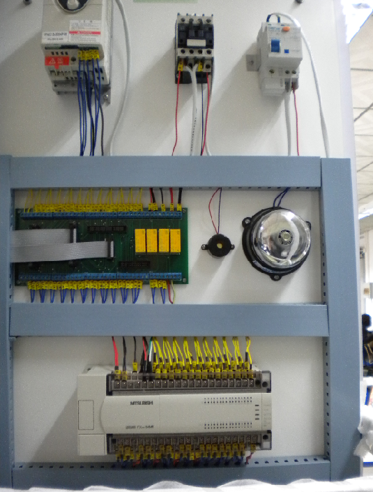 電梯電氣控制部分: 電源空氣開關(漏電脫扣器)、 DC12V 驅動電源、 PLC 可編程控制器、接線端口電路板、到站鐘、變頻器、報警蜂鳴器。