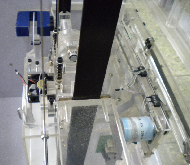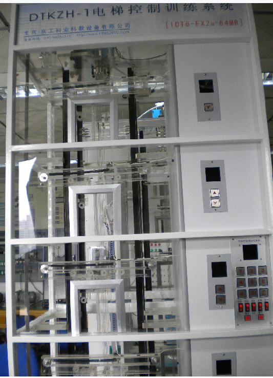 本電梯是根據(jù)最常見的升降式電梯結(jié)構(gòu),采用透明有機(jī)材料制成,其結(jié)構(gòu)與實(shí)際電梯完全相同,且?guī)缀蹙邆淞藢?shí)際電梯的所有功能。為了便于教學(xué),電梯大部分部件均是采用透明有機(jī)材料制成,使得電梯的內(nèi)部結(jié)構(gòu)一目了然;同時(shí),電梯的運(yùn)行過(guò)程,以及每個(gè)動(dòng)作都十分明了,且可以反復(fù)實(shí)際動(dòng)手操作。使學(xué)生能夠很直觀、透徹地了解、掌握電梯的結(jié)構(gòu)及其動(dòng)作原理,達(dá)到事半功倍的效果。解決了以往電梯教學(xué)中單純的理論教學(xué)方式或是參觀實(shí)際電梯時(shí)所帶來(lái)的不安全,無(wú)法全面了解其內(nèi)部結(jié)構(gòu)及運(yùn)行過(guò)程等種種實(shí)際問(wèn)題。 電梯的電氣控制系統(tǒng)采用三菱可編程控制器 (PLC) 實(shí)現(xiàn)邏輯智能控制,松下 VF200 交流變頻調(diào)速驅(qū)動(dòng),其硬件構(gòu)的組成及功能與實(shí)際電梯完全一樣。 具有自動(dòng)平層、自動(dòng)開門關(guān)門、順向響應(yīng)轎廂內(nèi)外呼梯信號(hào)、直駛、電梯安全運(yùn)行保護(hù)以及電梯急停、慢上、慢下、照明、風(fēng)扇等功能。且具有性能可靠、運(yùn)行平穩(wěn)、操作簡(jiǎn)單、能耗低和便于教學(xué)等特點(diǎn)。