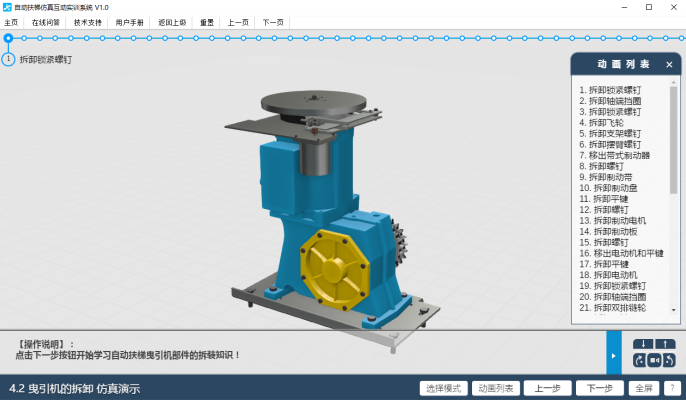 4 、扶梯拆卸仿真演示通過三維交互的動畫來動態(tài)的展示扶梯拆卸過程,按照特定的邏輯順序而設定,有拆裝的先后順序,符合實際操作中的流程和順序。此模塊是為了第一次使用拆裝仿真的師生,熟悉正確的操作流程和拆裝順序以及注意事項。在扶梯拆卸引導練習模式中,將要拆裝的零件會閃爍發(fā)光,提示用戶當前應該拆裝此零部件,點擊該零件,將反饋一個正確的提示音并播放該零件的拆裝動畫,如果操作錯誤,將反饋一個錯誤提示音并視為無效操作不播放任何動畫,直到選擇正確拆裝順序的零件,軟件才會播放其對應的動畫,完成之后再開始下一動作。