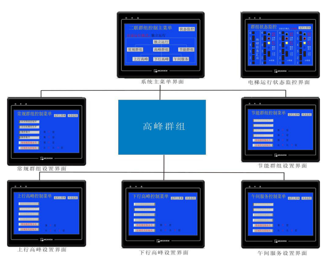 1.狀態監控,該功能可監視主、副梯的群組運行狀態、故障報警狀態、轎箱門狀態、電梯運行方向、電梯轎箱位置、電梯的優先調度、電梯所需響應的外呼召喚以及總體外呼任務設置。