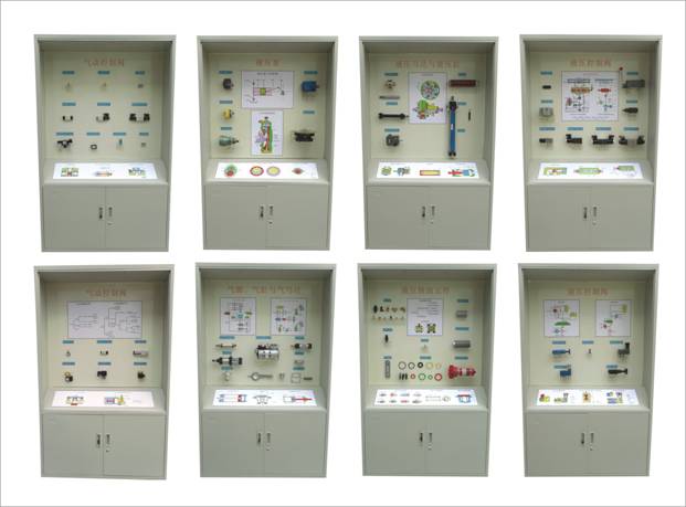 氣動液壓示教陳列柜是為了滿足大、中院校的教學(xué)需要,根據(jù)相關(guān)教材編制設(shè)計(jì)的現(xiàn)代教學(xué)設(shè)備,其中主要以實(shí)物或模型以及必要的圖文資料展示氣缸,控制閥,液壓泵,馬達(dá),控制閥等相關(guān)元件的基本類型與基本結(jié)構(gòu)。