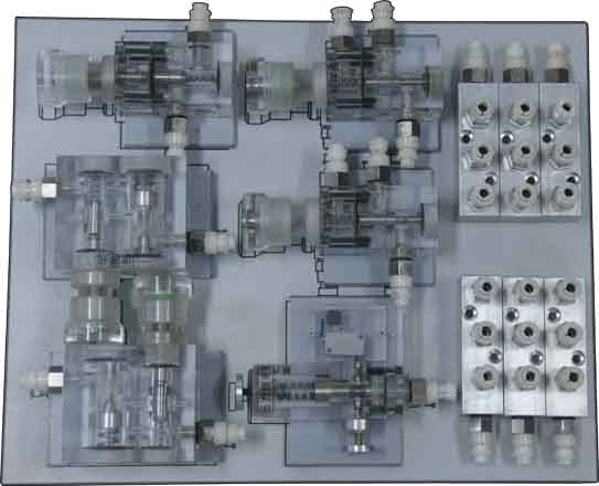 本產品的配有三塊液壓元件固定配置板。每塊元件固定配置板上設計有液壓元件及元件底板位置輪廓圖及液壓元件名稱。各種透明液壓元件(如油缸、閥、壓力表、壓力繼電器等等)均安放在元件固定配置板上的固定位置。防止元件缺失,便于實驗設備的管理。