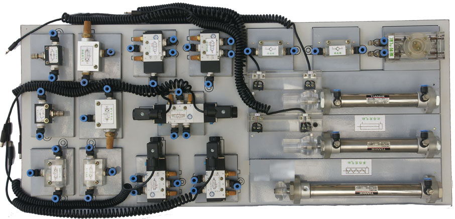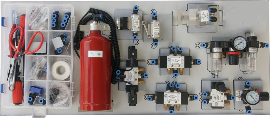 氣動面主要包括:梯形雙立面實驗臺、鐵質實驗桌、氣動元件(20多種)、電器控制模塊(5只)、空氣壓縮機、元件固定配置板、工具及附件等。