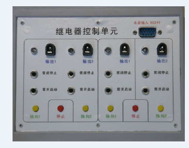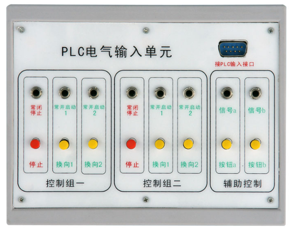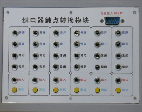 利用每組的測試按鈕作為主令按鈕,同時(shí)為繼電器控制模塊提供兩個(gè)常開啟動(dòng)信號(hào)、兩個(gè)常閉信號(hào)。利用每組的輸入插孔,對(duì)接入的觸點(diǎn)開關(guān)信號(hào)進(jìn)行轉(zhuǎn)換及擴(kuò)展。并可以輸入三線傳感器信號(hào)(正電源、負(fù)電源、信號(hào))。