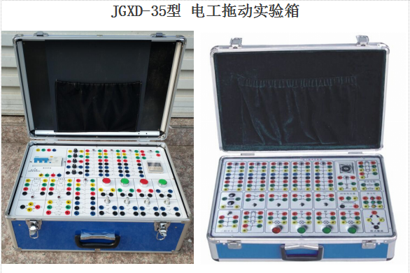 該實驗箱設置有交流接觸器、熱繼電器、組合開關、電子時間繼電器(通電延時)、整流橋、能耗制動電阻、保險座、行程開關、按鈕和模擬指示燈等。各器件的接線端子都引到面板上,方便學生接線。