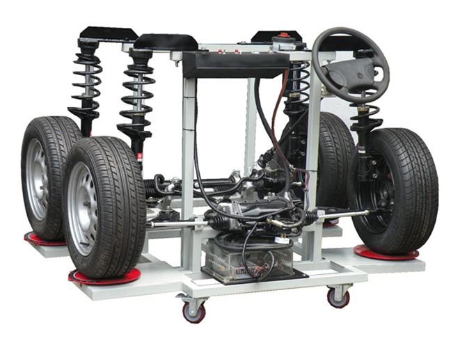 主要組成:前后懸架、 方向機、輪胎、 助力泵、轉(zhuǎn)向電機、方向盤、壓力表、轉(zhuǎn)向刻度盤、座椅、可移動臺架,配套使用說明書和實驗指導書等。主要功能: 1 .可模擬汽車在不同車速時四輪轉(zhuǎn)向的工作情況,并配有轉(zhuǎn)交盤可顯示轉(zhuǎn)向角度的大小,可進行動力轉(zhuǎn)向和非動力轉(zhuǎn)向?qū)嶒灒浜纤妮喍ㄎ粌x可做四輪定位實驗; 2 .通過拆裝實習,充分學習轉(zhuǎn)向系的結(jié)構(gòu)原理,裝配技巧,掌握轉(zhuǎn)向系統(tǒng)的調(diào)整內(nèi)容、方法及組裝順序;同時可方便地檢測裝配的效果和質(zhì)量; 3 .演示原車轉(zhuǎn)向系統(tǒng)的工作過程及轉(zhuǎn)向系統(tǒng)基本結(jié)構(gòu)組成和工作原理; 4 .可進行四輪定位檢測與調(diào)整,四輪定位三要素的調(diào)整和作用。制作工藝: 1 、帶鎖定的萬向腳輪移動裝置,移動自如,便于教學;