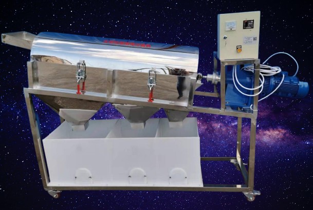 滾筒篩是最被廣泛選用的篩分機械。它是利用做回轉運動的筒形篩體將垃圾按粒度進行分級的機械,其篩面一般為編織網或打孔薄板,工作時,筒形篩體傾斜安裝,傾角一般為 4 ° ~ 8 ° 。被篩分的垃圾進入篩體內部后隨篩體的轉動做螺旋狀翻動,粒度小于篩孔的物料被篩下成為篩下物,而留在篩體上的物料為篩上物,從篩體底端排出。通常筒形篩體通過圓環體支撐于機架上的支撐滾輪上,并由軸承、鏈、皮帶或摩擦輪進行驅動。