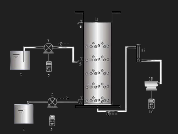 1. 進水桶 2. 進水泵 3. 進水泵開關 4. 進水閥 5. 出水閥 6. 取樣閥 7. 出水泵 8. 出水泵開關 9. 出水桶 10. 微孔曝氣盤 11. 反應器 12. 轉子流量計 13. 蠕動泵 14. 蠕動泵開關