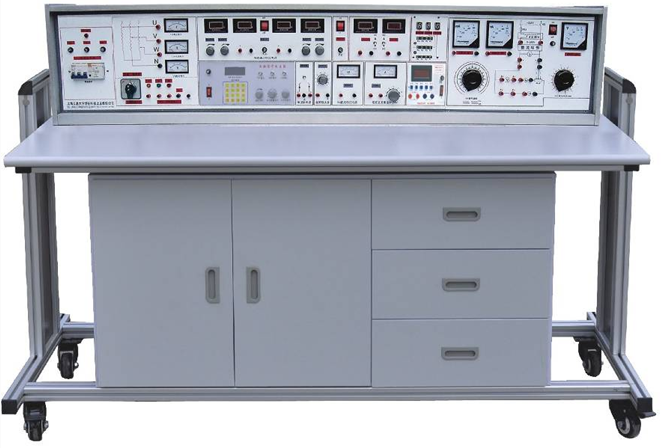 電工、模電、數電、電氣控制(帶直流電機)綜合實驗臺具有較完善的安全保護措施,較齊全的功能。實驗操作桌中央配有通用電路插扳,電路板由 ABS 注塑而成,背面裝有壓鑄而成九孔成一組的銅片,表面布有九孔成一組相互聯通的插孔,創新實驗元件模塊在其上任意拼插成實驗電路。實驗元件制成透明創新模塊,直觀性好,盒蓋印有元件符號,線條清晰美觀。盒體與盒蓋采用較科學的壓卡式結構,維修、更換元件拆裝方便。元器件放置在實驗操作桌下邊左右柜內,實驗時取存方便,大大提高了管理水平,規劃化程度,大大減輕了教師實驗準備工作。