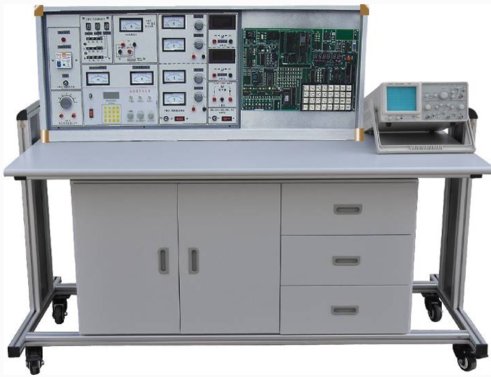 1 、實驗操作桌 12 張,一桌二座。操作桌桌面中央設置通用電路插扳(尺寸 :35×90cm ),電路板由 ABS 注塑而成,背面裝有壓鑄而成九孔成一組的銅片,表面布有九孔成一組相互聯通的插孔,創新實驗元件模塊在其上任意拼插成實驗電路。創新實驗元件模塊盒體透明直觀,內裝元件一目了然,盒蓋與盒體之間采用壓卡式結構、維修拆裝、更換方便。每張操作桌配有一粒膠皮板,保護通用電路插板和桌面 ( 如需要在桌上放置電機、焊接等 ). 實驗操作桌下部有二只元件儲存柜,放置實驗元器件及儲存板。