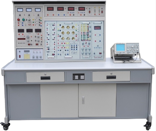 實訓桌為鐵質雙層亞光密紋噴塑結構,桌面為防火、防水、耐磨高密度板;左右設有兩個大抽屜(帶鎖),用于放置工具及資料。右邊設有放置示波器用的可拆卸擱板。