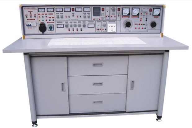 (一)實驗桌:學生實驗桌 12 張,一桌二座,實驗桌外形尺寸為 160 × 70 × 80cm 。桌子中央配置九孔電路插板,電路板注塑而成,表面布有九孔成一組相互聯通的插孔,元件盒在其上任意拼插成實驗電路。元件盒盒體透明直觀,內裝電阻、電容、電感、二極管、三極管、場效應管、可控硅等元件來完成原理實驗。內裝元件一目了然,盒蓋印有元件符號,線條清晰美觀。盒體與盒蓋采用較科學的壓卡式結構,維修、拆裝方便。繼電部分訓練元器件已裝在特制的元件盒上,實訓時插在九孔電路板上即可連線實驗,方便,靈活。電子技能實訓項目由二十幾套實訓電路板和相應元器件來完成。每張操作桌配有一粒膠皮板,保護通用電路板和桌面 ( 如需要在桌上放置電動機,焊接等 ) 桌子下部是元器件儲存柜,放置實驗元件、器材、工具等。