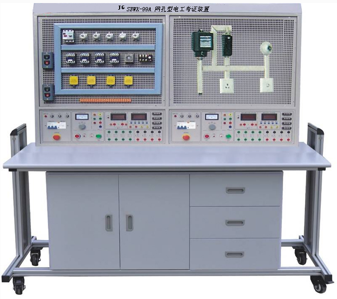 網(wǎng)孔型電工考證裝置主要由實訓桌、網(wǎng)孔板、實訓元器件組成。學生根據(jù)實訓線路進行元器件的合理布局,安裝、接線全部由學生自行完成,接近工業(yè)現(xiàn)場。能完成機床線路,電機控制線路,照明配電的模擬操作、安裝調(diào)試的綜合實訓,訓練學生動手能力和實操技能。實訓項目可自行確定,根據(jù)所選的項目選擇相應(yīng)的元器件。該裝置也可作為電工考工的考核設(shè)備。