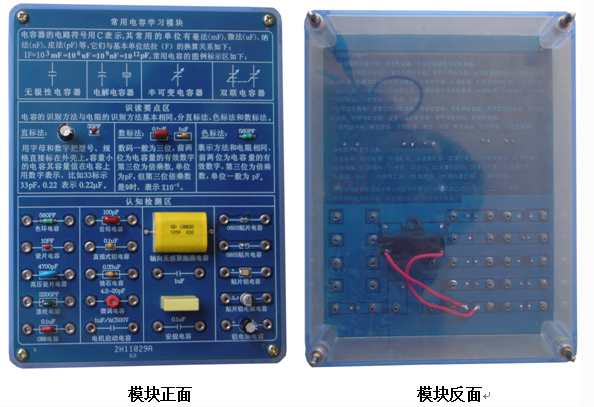 設有三組高壓電容(每組 1uF/500V 、 2.2uF/500V 、 4.7uF/500V 高壓電容各一只),用以改變功率因數實訓;提供實訓所需的各種元件,如電阻、二極管、發光管、穩壓管、電位器及 12V 燈泡等 , 還提供十進制可調電阻箱,阻值為 0 ~ 99999.9Ω/2W 。
