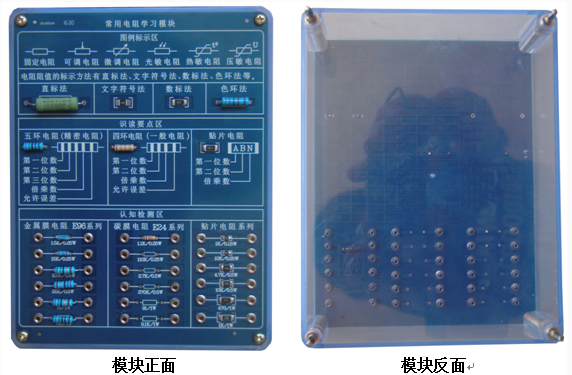 底盒使用 190mm × 145mm 的開模有機透明塑料底盒,模塊面板采用印制電路板 PCB 工藝,可以直觀看到器件的實物及相關的原理介紹。對于易損器件安裝在面板背面,透過透明底盒能夠看到器件實物,方便感性認識、檢測測試,同時也能防止器件的損傷。