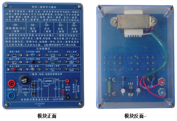 提供二極管、電容、電阻的綜合應用電路:單相橋式整流濾波電路 -DC5V 電源的產生電路,帶有熔絲保護及發光二極管指示,通入單相 AC220 市電即可工作(模塊設有單相電源變壓器),同時該 DC5V 電源可為其他模塊檢測供電之用。