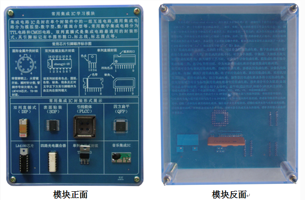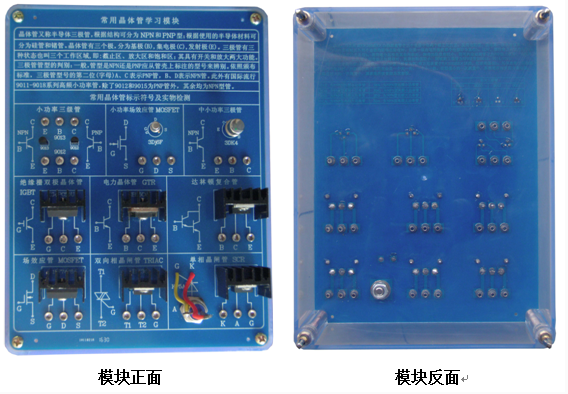 底盒使用 190mm × 145mm 的開模有機透明塑料底盒,模塊面板采用印制電路板 PCB 工藝,可以直觀看到器件的實物及相關的原理介紹。對于典型應用及易損器件安裝在面板背面,透過透明底盒能夠看到器件實物,方便感性認識、檢測測試,同時也能防止器件的損傷。