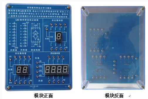 展示共陰及共陽數碼管的結構示意圖及常用數字的數碼顯示方法,展示了單位數碼管、雙位數碼管、四位數碼管的實物并提供了可供檢測的臺階插座(內孔 2MM )。
