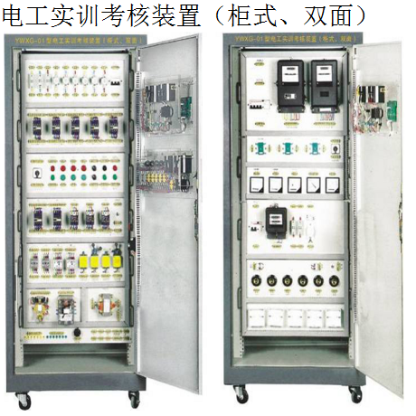 JGTC-YWXG-01 型電工實(shí)訓(xùn)考核裝置可完成“電工技術(shù)”、“工廠電氣控制”、“機(jī)床線路控制”、“可編程控制技術(shù)”等多門課程的實(shí)訓(xùn)。裝置資源開放,可充分培養(yǎng)學(xué)生的實(shí)際動(dòng)手能力,適合當(dāng)今教育教學(xué)中的實(shí)訓(xùn)訓(xùn)練。本裝置采用用標(biāo)準(zhǔn)配電柜為主體柜、雙面結(jié)構(gòu),包含如下資源:電源控制、三相交流電源,直流電源,勵(lì)磁電源、電樞電源、測(cè)量?jī)x表、可編程控制器(三菱系列)、模擬量模塊、編碼器、彩色觸摸屏、變頻器(三菱系列)、控制軟件、交流接觸器、按鈕、指示燈、時(shí)間繼電器、行程開關(guān)、中間繼電器、三相異步電機(jī)、直流電機(jī)等。適用于大中專院校及職業(yè)教育培訓(xùn)機(jī)構(gòu)教學(xué)實(shí)驗(yàn)與技能實(shí)訓(xùn)考核的電工鑒定設(shè)備。