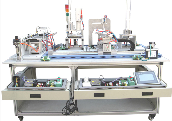 實訓裝置由由鋁合金導軌式實訓臺、典型的機電一體化設備的機械部件、 PLC 模塊、變頻器模塊、按鈕模塊、電源模塊、模擬生產設備實訓模塊、接線端子排和各種傳感器、計算機等組成。整體結構采用開放式和拆裝式,實訓裝置用于機械部件組裝,可根據現有的機械部件組裝生產設備,也可添加機械部件組裝其他生產設備,使整個裝置能夠靈活的按教學或競賽要求組裝具有生產功能的機電一體化設備。模塊采用標準結構和抽屜式模塊放置架,互換性強;按具有生產性功能和整合學習功能的原則確定模塊內容,使教學或競賽時可方便的選擇需要的模塊。設備需完全符合電工電子全國職業技能大賽所要求,同時還要求具有可拓展功能,可以組成更加大型的生產模擬系統,以配合各個用戶學校不同層次,不同專業的教學及培訓要求。