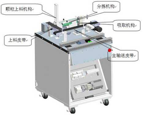 上料皮帶逐個將空瓶輸送到主輸送皮帶;同時顆粒上料機構將料筒內的物料推出;顆粒分揀機構對顆粒物料根據顏色進行分揀;當空瓶到達填裝位后,皮帶停止,定位夾緊機構將空瓶固定;吸取機構將分揀到位的顆粒物料吸取放到空瓶內;瓶子內物料到達設定的顆粒數量后,定位夾緊機構松開,皮帶啟動,將瓶子輸送到下一個工位。此單元可以設定多樣化的填裝方式,可從物料顏色( 2 種)、顆粒數量(最多 4 粒)進行不同的組合,產生 8 種填裝方式。