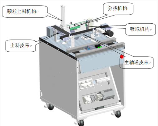上料皮帶逐個將空瓶輸送到主輸送皮帶;同時顆粒上料機(jī)構(gòu)將料筒內(nèi)的物料推出;顆粒分揀機(jī)構(gòu)對顆粒物料根據(jù)顏色進(jìn)行分揀;當(dāng)空瓶到達(dá)填裝位后,皮帶停止,定位夾緊機(jī)構(gòu)將空瓶固定;吸取機(jī)構(gòu)將分揀到位的顆粒物料吸取放到空瓶內(nèi);瓶子內(nèi)物料到達(dá)設(shè)定的顆粒數(shù)量后,定位夾緊機(jī)構(gòu)松開,皮帶啟動,將瓶子輸送到下一個工位。此單元可以設(shè)定多樣化的填裝方式,可從物料顏色( 2 種)、顆粒數(shù)量(最多 4 粒)進(jìn)行不同的組合,產(chǎn)生 8 種填裝方式。