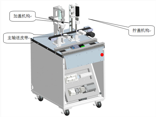 接收上一工作站填裝好顆粒的瓶子,當(dāng)瓶子被輸送到加蓋機(jī)構(gòu)后,主輸送皮帶停止,夾蓋定位夾緊機(jī)構(gòu)將瓶子固定,加蓋機(jī)構(gòu)啟動加蓋流程,將蓋子加到瓶子上;加好蓋子后主輸送皮帶啟動,加上蓋子的瓶子繼續(xù)被送往擰蓋機(jī)構(gòu),到擰蓋機(jī)構(gòu)下方,主輸送皮帶停止,擰蓋定位夾緊機(jī)構(gòu)將瓶子固定,擰蓋機(jī)構(gòu)啟動,將瓶蓋擰緊,主輸送皮帶啟動,將擰好蓋子的物料瓶輸送到下一工位。瓶蓋分為白色和黑色兩種。