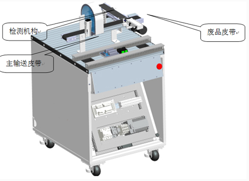 主皮帶運(yùn)行,接收上一站擰好蓋后的物料瓶子,當(dāng)物料瓶經(jīng)過檢測機(jī)構(gòu)時:回歸反射傳感器檢測瓶蓋是否擰緊;檢測機(jī)構(gòu)檢測瓶子內(nèi)部顆粒是否符合要求;對擰蓋與顆粒均合格的瓶子進(jìn)行瓶蓋顏色判別區(qū)分;擰蓋或顆粒不合格的瓶子被分揀機(jī)構(gòu)推送到廢品皮帶上(短皮帶);擰蓋與顆粒均合格的瓶子被輸送到皮帶末端,等待機(jī)器人搬運(yùn)。