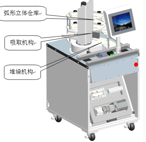 由一個弧形立體倉庫和 2 軸伺服堆垛機(jī)構(gòu)組成,當(dāng)工業(yè)機(jī)器人工作站完成包裝任務(wù),接收信號把機(jī)器人工作站物料臺上的包裝盒體吸取出來,然后按要求依次放入倉儲相應(yīng)倉位。 2 × 3 的倉庫每個倉位均安裝一個檢測傳感器,堆垛機(jī)構(gòu)水平軸為精密分度盤機(jī)構(gòu),垂直機(jī)構(gòu)為渦輪絲桿升降機(jī)構(gòu),均由西門子 V90 精密伺服電機(jī)進(jìn)行高精度控制。