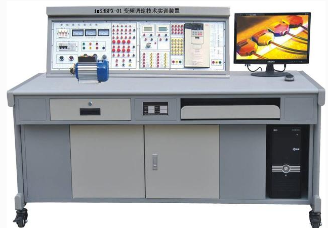 變頻調速技術實訓裝置由控制屏、實訓桌、變頻實訓組件、繼電接觸實訓組件、數字量 / 模擬量輸入輸出給定指示組件、三相異步電機、電機導軌、測速機構等組成。