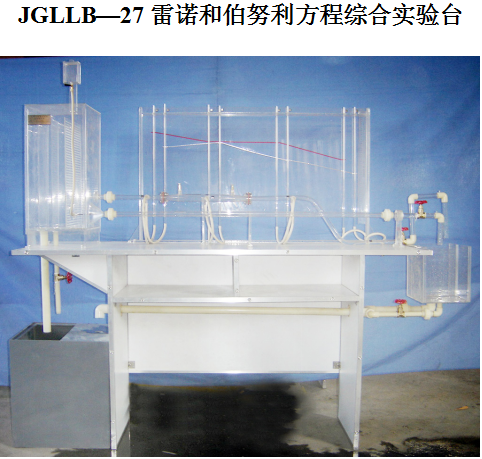 供水箱(工程塑料厚 4mm 、容積約 0.05 立方米)、穩壓水箱(有機玻璃厚 4mm 、容積約 0.025 立方米)、雷諾實驗管道(有機玻璃厚 3mm 、內徑 14mm )、伯努利實驗管道(有機玻璃厚 3mm 、內徑 D1=14mm 、 D2=25mm )、顏色罐、針閥、水泵(型號: AP3500 ,產地:廣東振華電器有限公司)、計量水箱(有機玻璃厚 4mm ,容積 10L )、壓差板、循環管道(工程塑料厚 3mm )、實驗桌等。