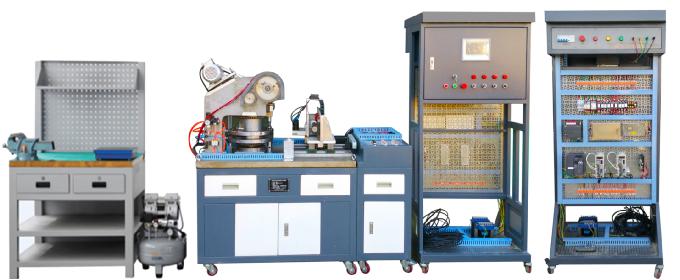 本實訓裝置主要由實訓臺、電氣控制柜(包括電源控制模塊、可編程控制器模塊、變頻器模塊、觸摸屏模塊、步進電機驅動模塊、伺服電機驅動模塊等)、動力源(包括三相交流電機、步進電機、交流伺服電機等)、機械傳動機構、二維送料部件(十字滑臺)、轉塔部件、模具、 離合器機構、 機械式沖料機構、裝調工具、常用量具、操作臺、型材電腦桌等組成。