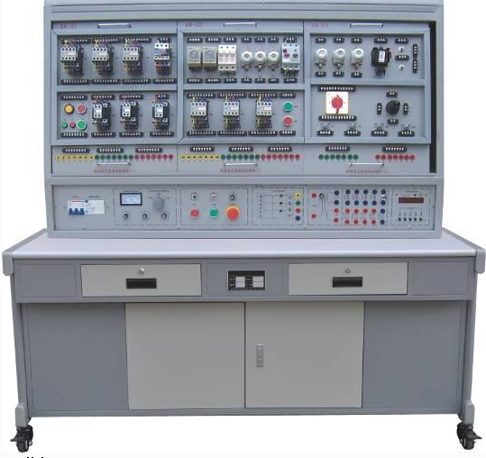 實訓桌為鐵質雙層亞光密紋噴塑結構,桌面為防火、防水、耐磨高密度板、結構堅固,造型美觀大方。桌子左右各設有兩個抽屜(帶鎖),并帶有柜子,分別可用于放置掛件和實訓物品。