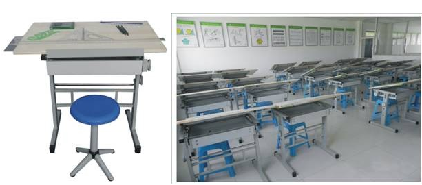 多功能實用繪圖桌 升降繪圖桌支架采用鋼架結(jié)構(gòu),桌面板采用東北優(yōu)質(zhì)加厚椴木材料的1號繪圖板,并可調(diào)節(jié)傾角0°-85°,桌面下部有儲物隔板,可以放置書包、文具和圖紙等物品,牢固耐用,適用于機械制圖繪圖和繪畫專業(yè),在院校內(nèi)實用和經(jīng)濟的一款多功能和升降繪圖繪畫桌,有較強的多種行業(yè)和課程的兼容性和普及性。