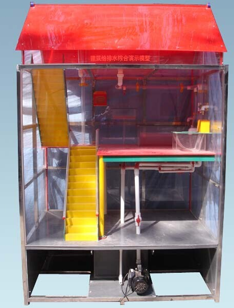 2、整個系統由鍋爐及循環泵實現熱循環演示。有機玻璃洗澡間包括:、浴缸 1 套、洗臉盤 1 套、大便器 1 套、配水箱 1 只、水泵 1 臺、樓梯、連接管道和球閥、不銹鋼支架等組成。