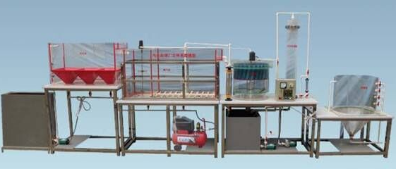 本裝置以現(xiàn)場(chǎng)工程中的小型污水處理廠部分處理系統(tǒng)為原型,其中配置多斗初沉池、曝氣池、二沉池、砂濾裝置及濃縮池等;污水通過配水箱被提升至初沉池進(jìn)行初級(jí)污泥沉淀,然后進(jìn)至曝氣池進(jìn)行接觸氧曝氣處理,曝氣通過小型空氣壓縮機(jī),并通過風(fēng)量計(jì)進(jìn)行對(duì)曝氣量的控制;經(jīng)過曝氣池的污水再通過二沉池進(jìn)行沉淀;再進(jìn)入砂濾裝置進(jìn)行過濾;最后進(jìn)入濃縮池進(jìn)行濃縮處理。學(xué)生通過對(duì)該污水處理廠立體布置模型系統(tǒng)的學(xué)習(xí),可了解系統(tǒng)中典型污水處理系統(tǒng)的應(yīng)用,掌握各個(gè)系統(tǒng)的工作原理,進(jìn)而具備設(shè)計(jì)污水處理廠各處理系統(tǒng)的能力。