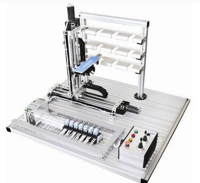 本裝置為實際自動倉儲系統的微縮,使用可編程控制器控制,設有12個貨位,在X、Y、Z軸三個方向上準確地驅動感應電動機進行自動儲存或取出儲存的成品,完善的執行機構可實現現代物流系統中自動存儲系統全部動作過程。PLC自備。